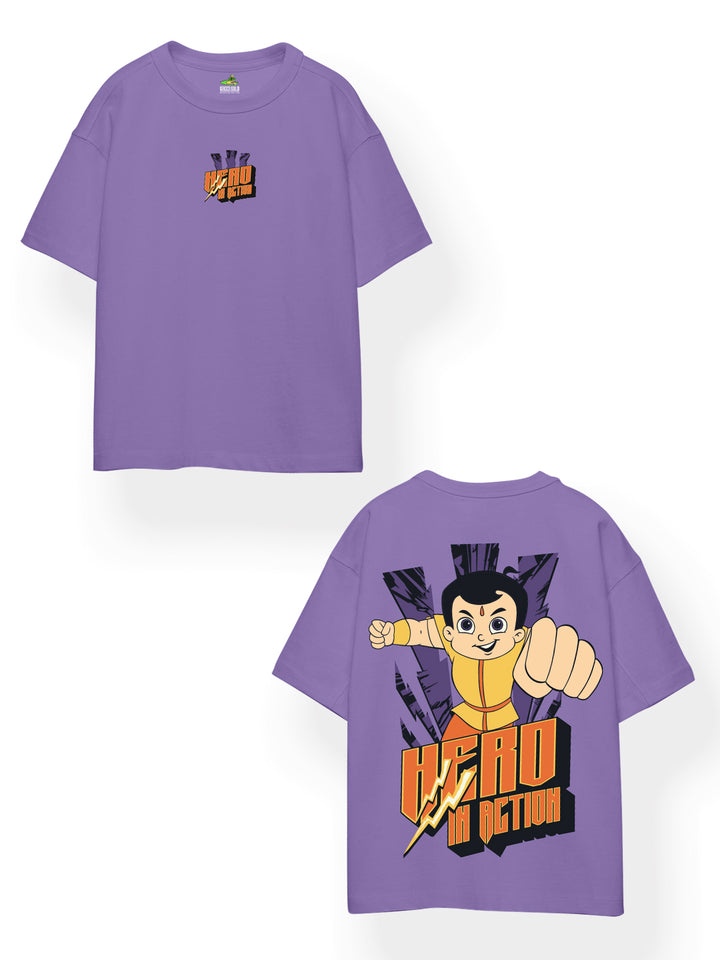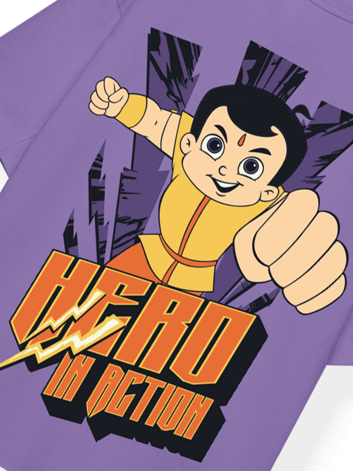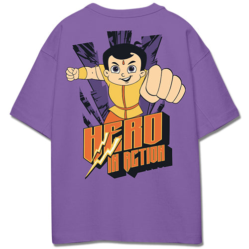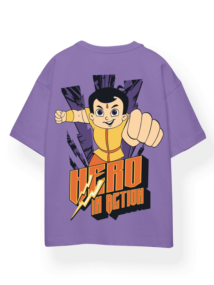 Featuring a dynamic HERO IN ACTION Chhota Bheem graphic, this oversized tee adds bold style and heroic vibes to your child's wardrobe. Perfect for daily wear, school, or fun outings, it’s a great choice for young fans who admire Bheem's strength, courage, and energy.